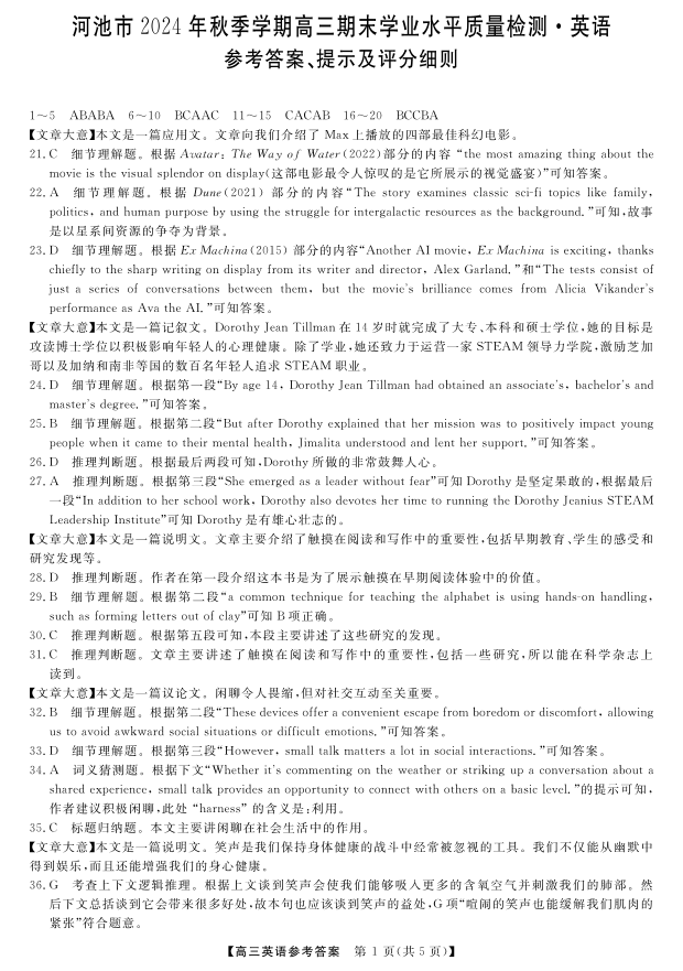 广西河池市2025届高三年级期末教学质量检测 英语答案.pdf