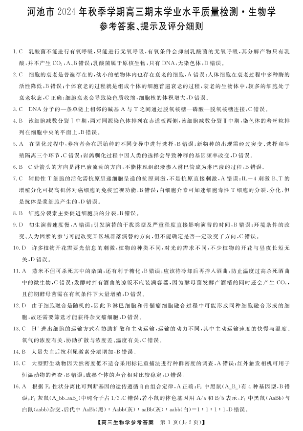 广西河池市2025届高三年级期末教学质量检测 生物答案.pdf
