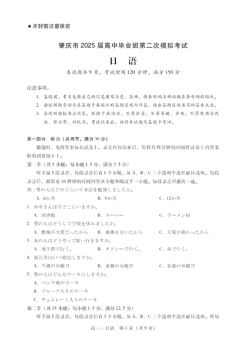 广东省肇庆市2025届高中毕业班第二次模拟考试 日语.pdf