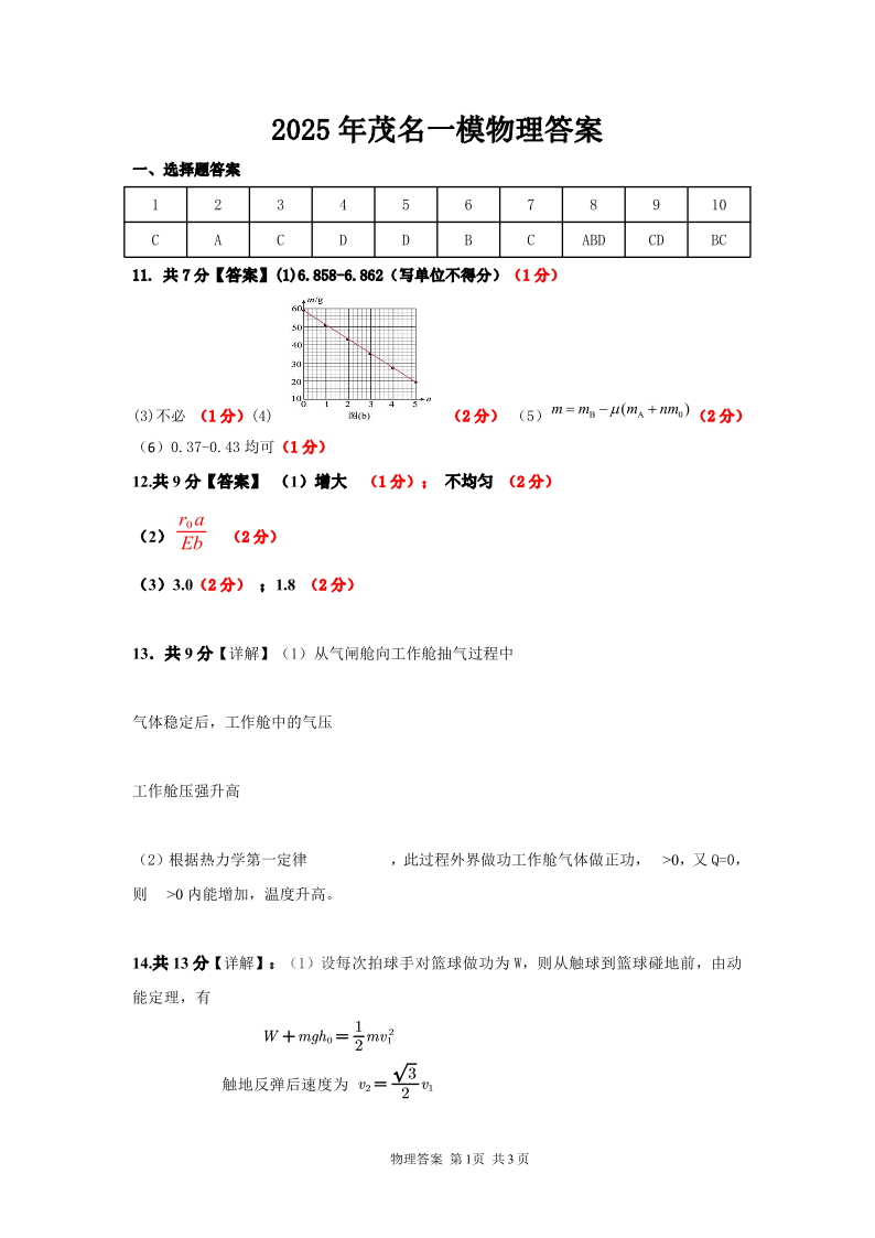 广东省茂名市2025届高三上学期第一次综合测试 物理答案.pdf