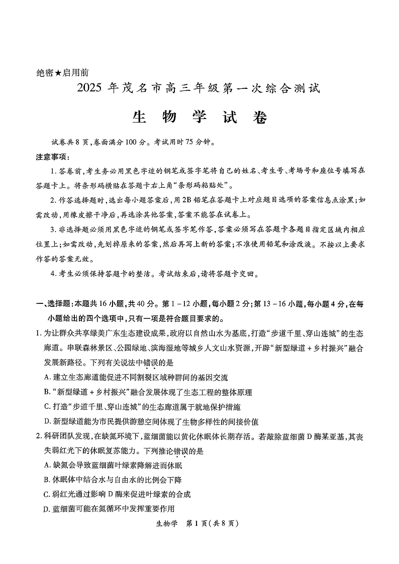 广东省茂名市2025届高三上学期第一次综合测试 生物.pdf