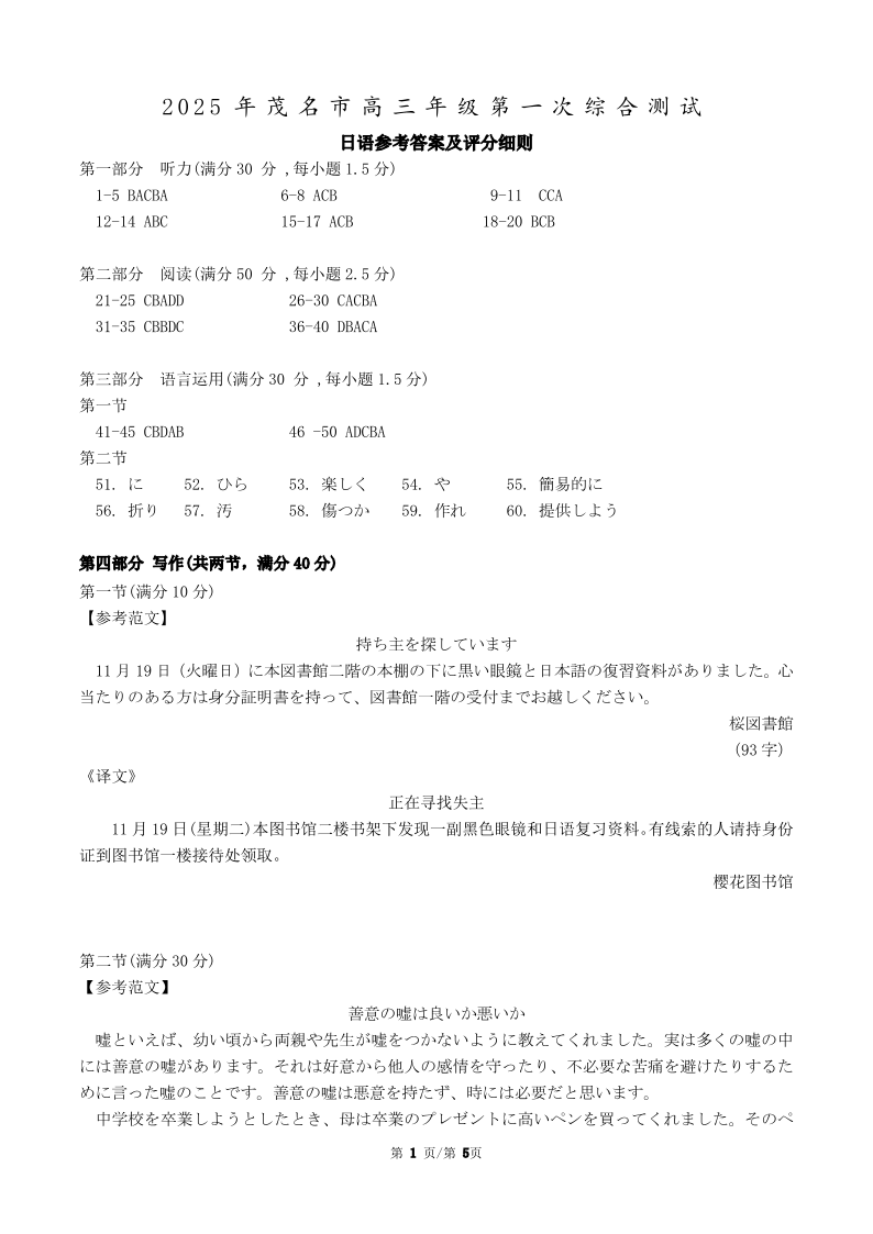 广东省茂名市2025届高三上学期第一次综合测试 日语答案.pdf