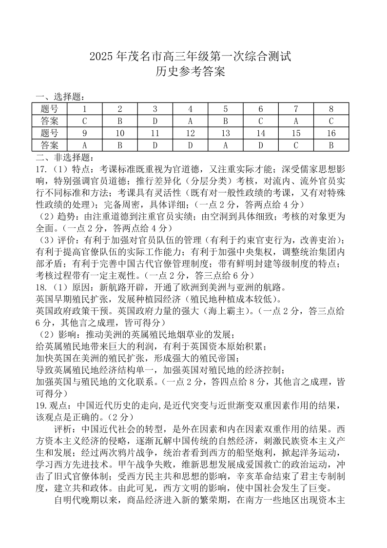 广东省茂名市2025届高三上学期第一次综合测试 历史答案.pdf