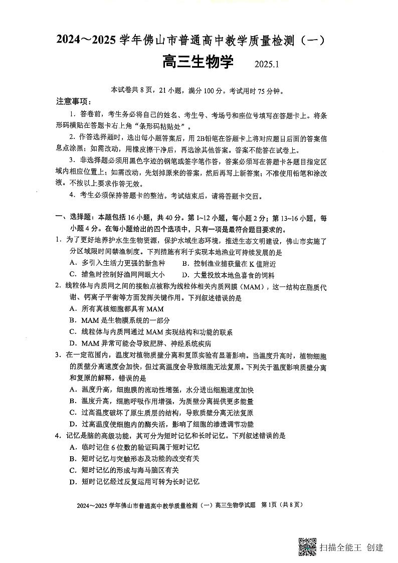 广东省佛山市2025届高三上学期教学质量检测(一)生物.pdf