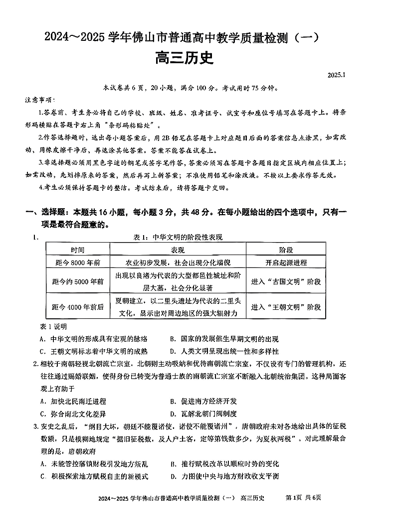 广东省佛山市2025届高三上学期教学质量检测(一)历史.pdf