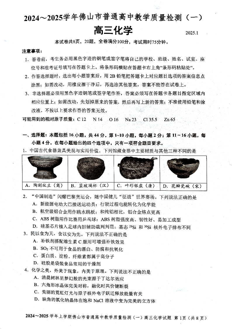 广东省佛山市2025届高三上学期教学质量检测(一)化学.pdf
