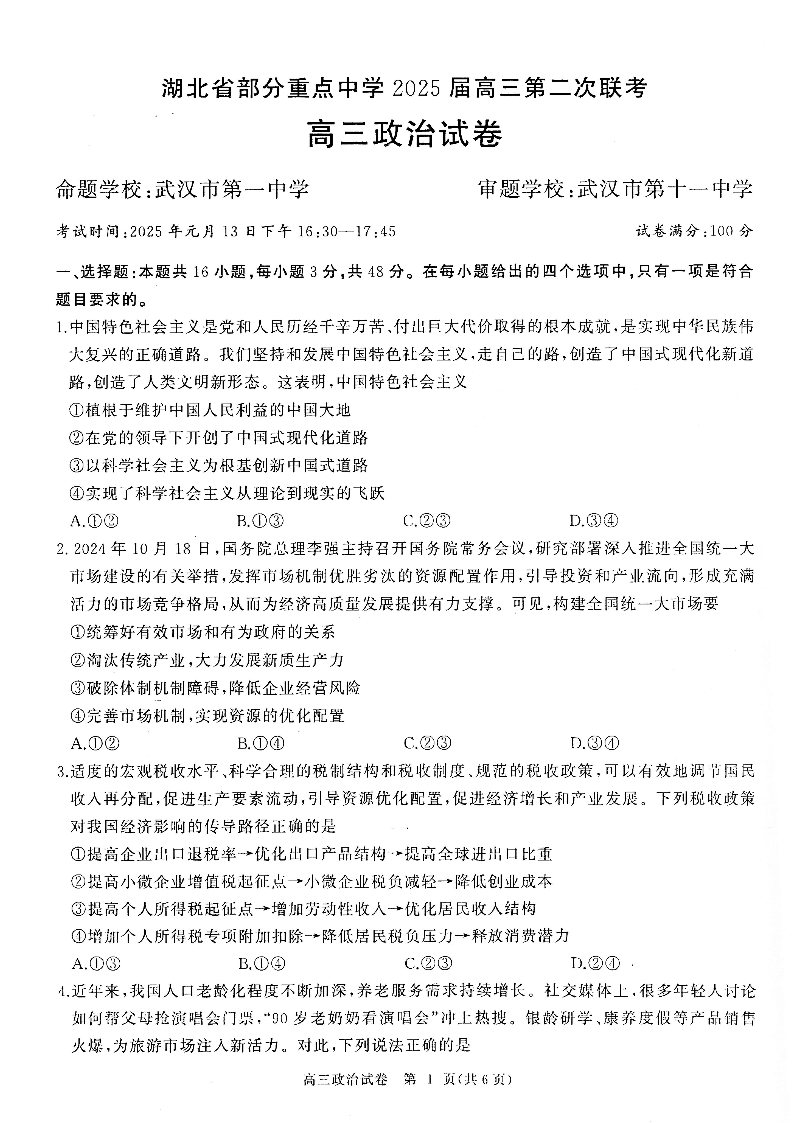 湖北省部分重点中学2025届高三第二次联考 政治.pdf