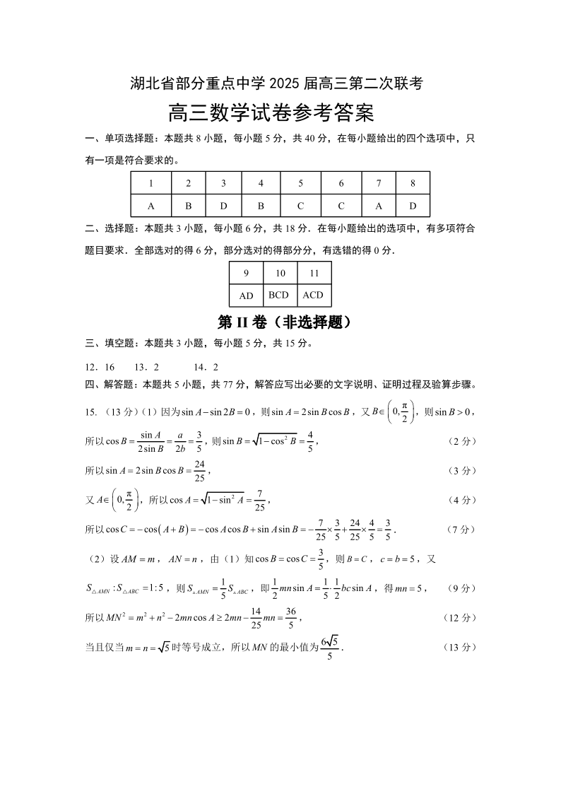 湖北省部分重点中学2025届高三第二次联考 数学答案.pdf
