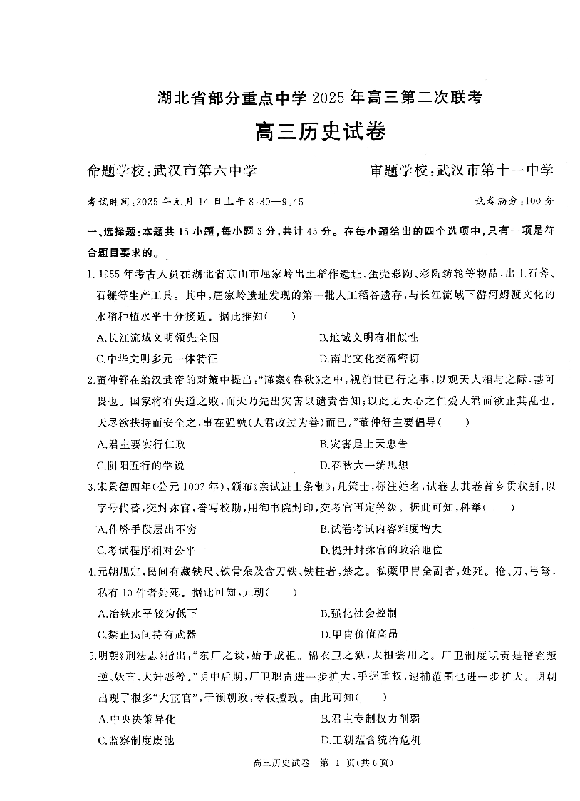 湖北省部分重点中学2025届高三第二次联考 历史.pdf