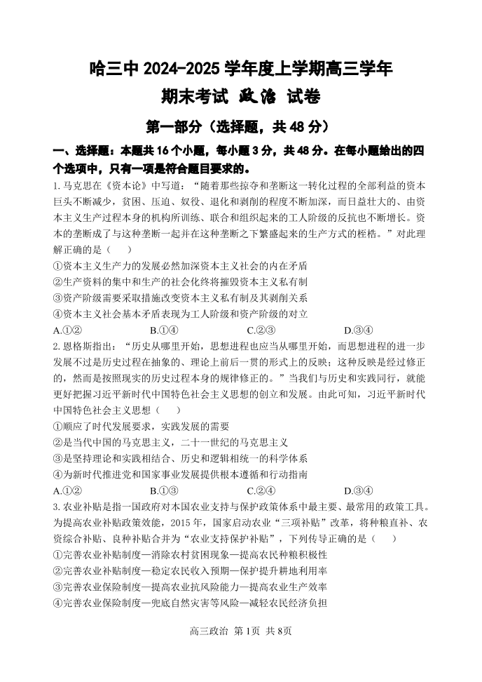 哈三中2024-2025学年度上学期高三学年期末考试 政治.pdf