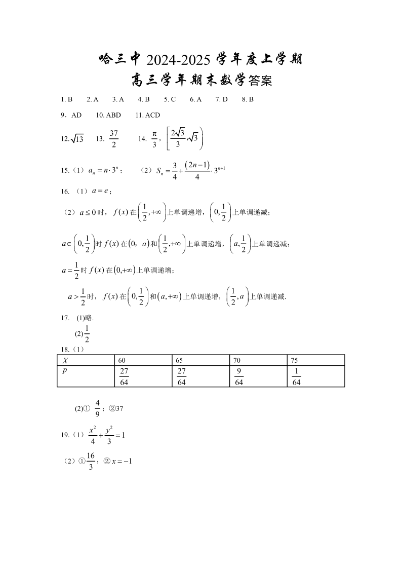 哈三中2024-2025学年度上学期高三学年期末考试 数学答案.pdf