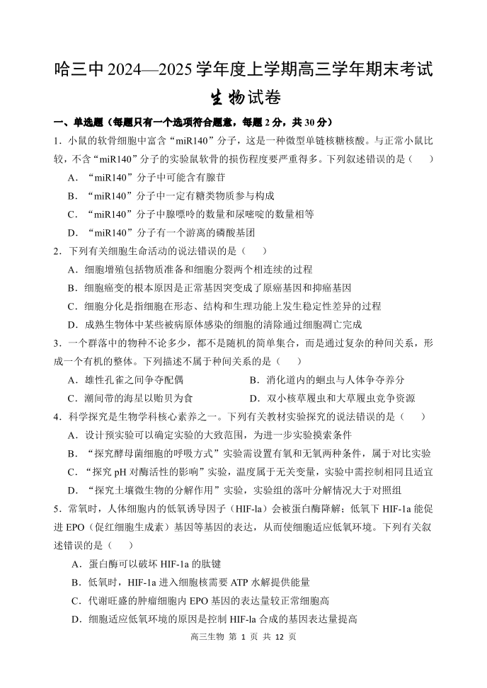 哈三中2024-2025学年度上学期高三学年期末考试 生物.pdf