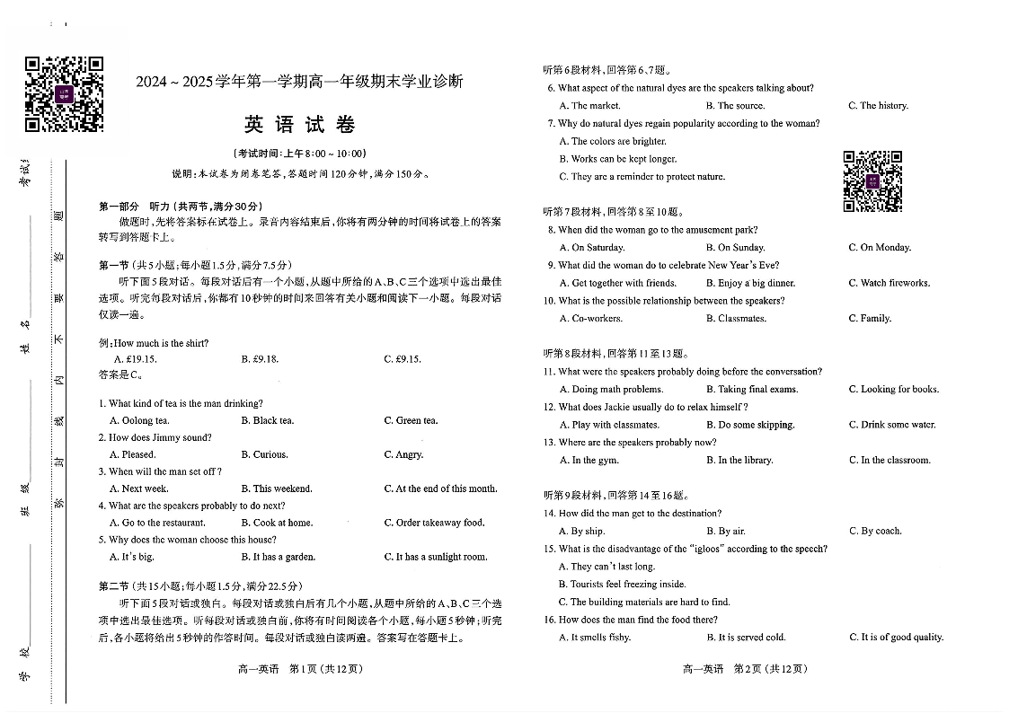 山西省太原市2024-2025学年高一上学期期末学业诊断 英语.pdf