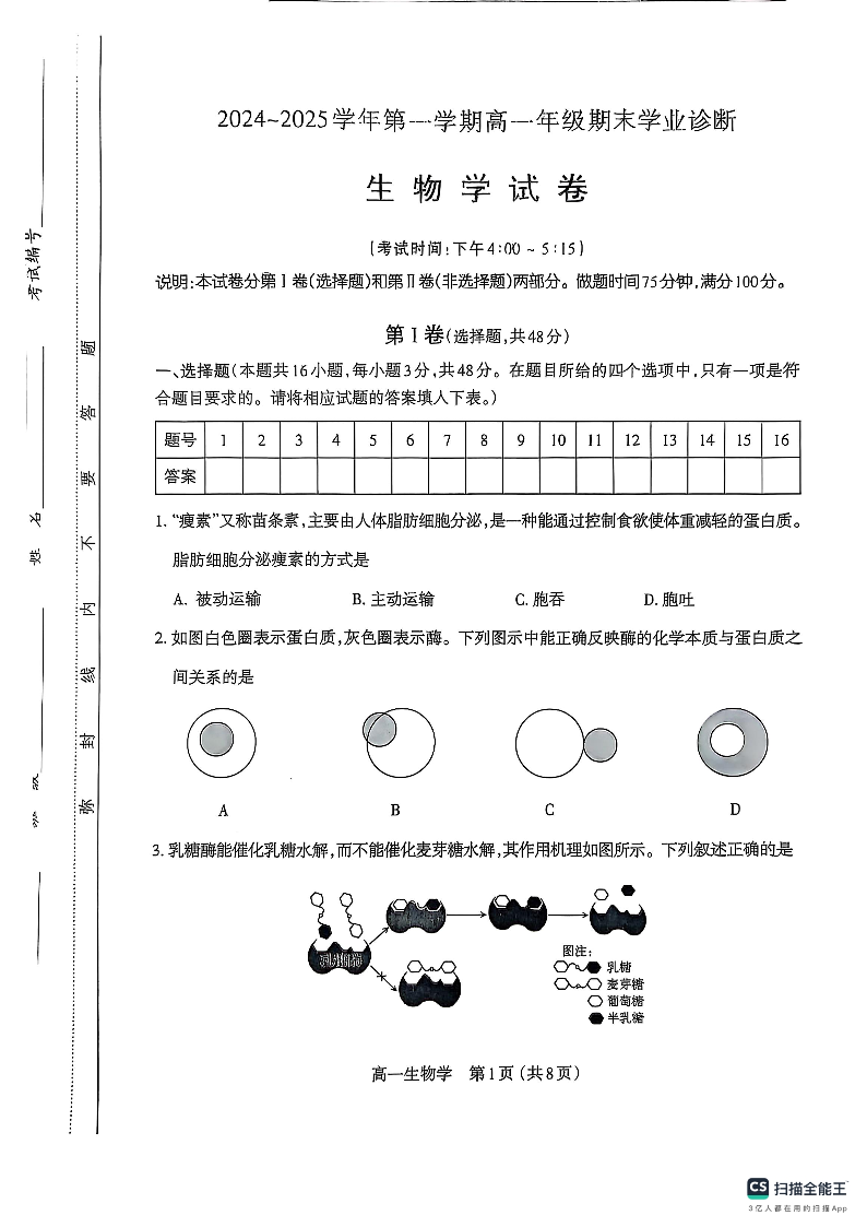 山西省太原市2024-2025学年高一上学期期末学业诊断 生物.pdf