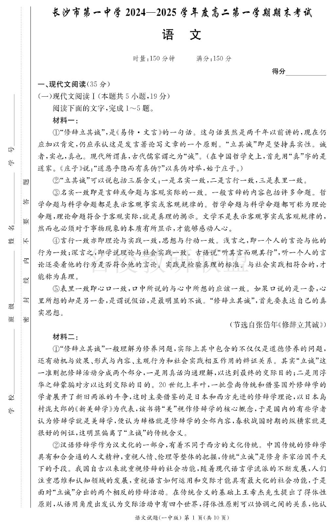 湖南省长沙市第一中学2024-2025学年高二上学期期末考试 语文.pdf