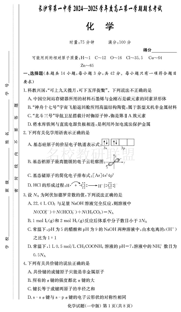 湖南省长沙市第一中学2024-2025学年高二上学期期末考试 化学.pdf