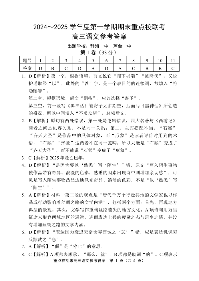 天津市五区县重点校2024-2025学年高三上学期期末考试 语文答案.pdf