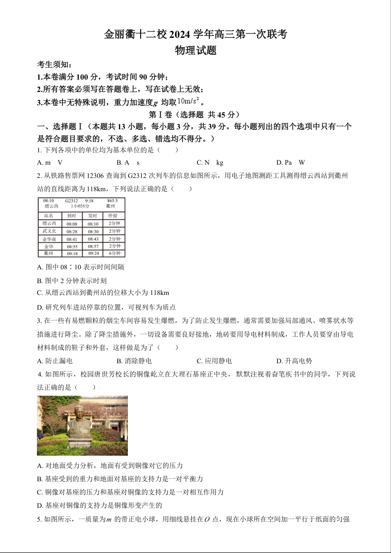 浙江省金丽衢十二校2024学年高三第一次联考 物理.docx