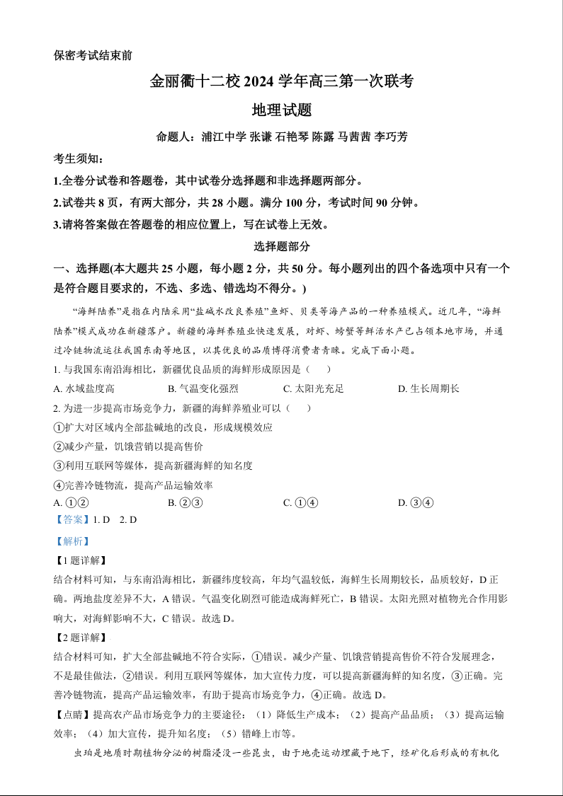 浙江省金丽衢十二校2024学年高三第一次联考 地理答案.docx