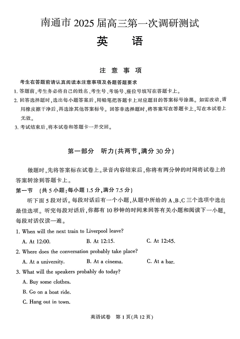 江苏省南通市、泰州市、镇江市、盐城市2025届高三第一次调研测试 英语.pdf