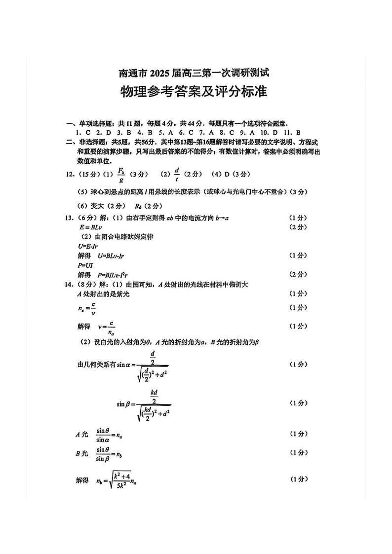 江苏省南通市、泰州市、镇江市、盐城市2025届高三第一次调研测试 物理答案.pdf