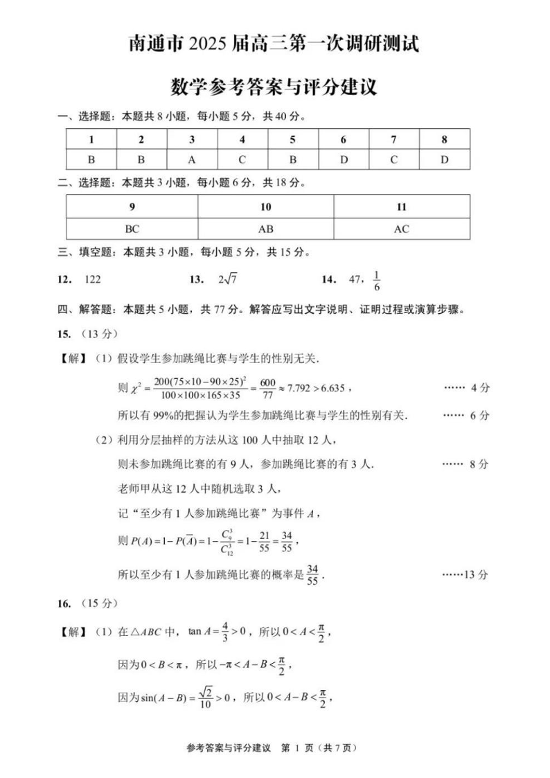 江苏省南通市、泰州市、镇江市、盐城市2025届高三第一次调研测试 数学答案.pdf