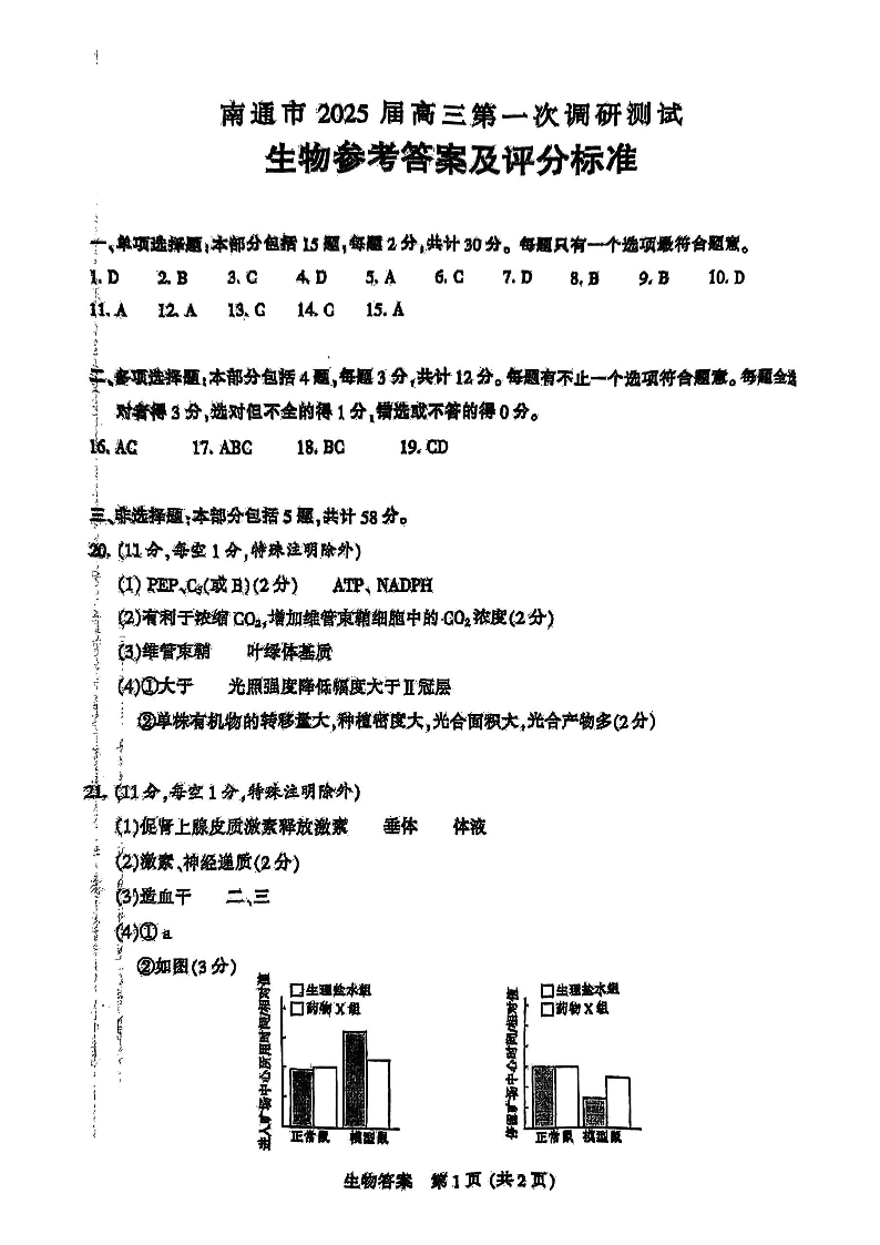 江苏省南通市、泰州市、镇江市、盐城市2025届高三第一次调研测试 生物答案.pdf