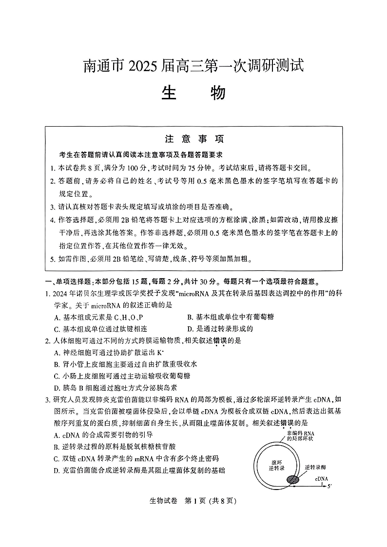 江苏省南通市、泰州市、镇江市、盐城市2025届高三第一次调研测试 生物.pdf