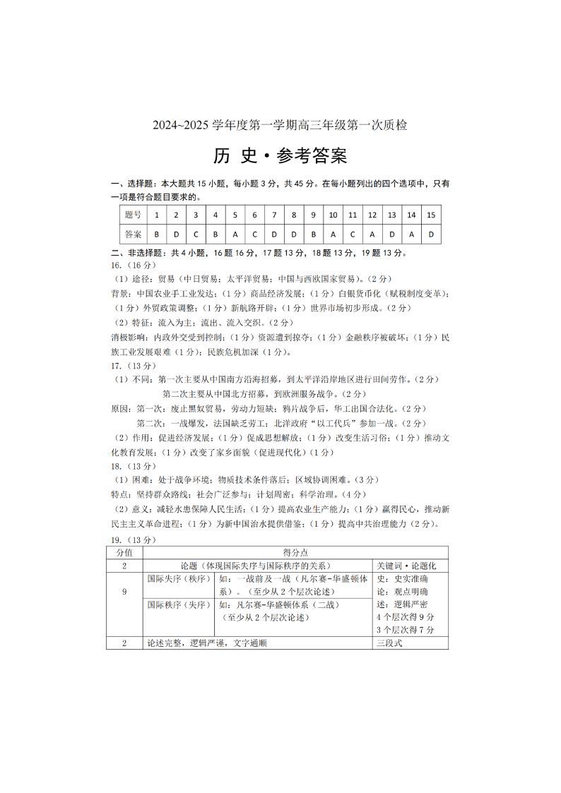 苏北四市2024~2025学年度第一学期高三年级第一次质检 历史答案.pdf
