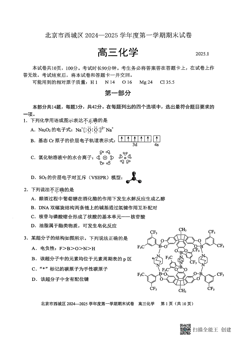 北京市西城区2024-2025学年高三上学期期末考试 化学.pdf