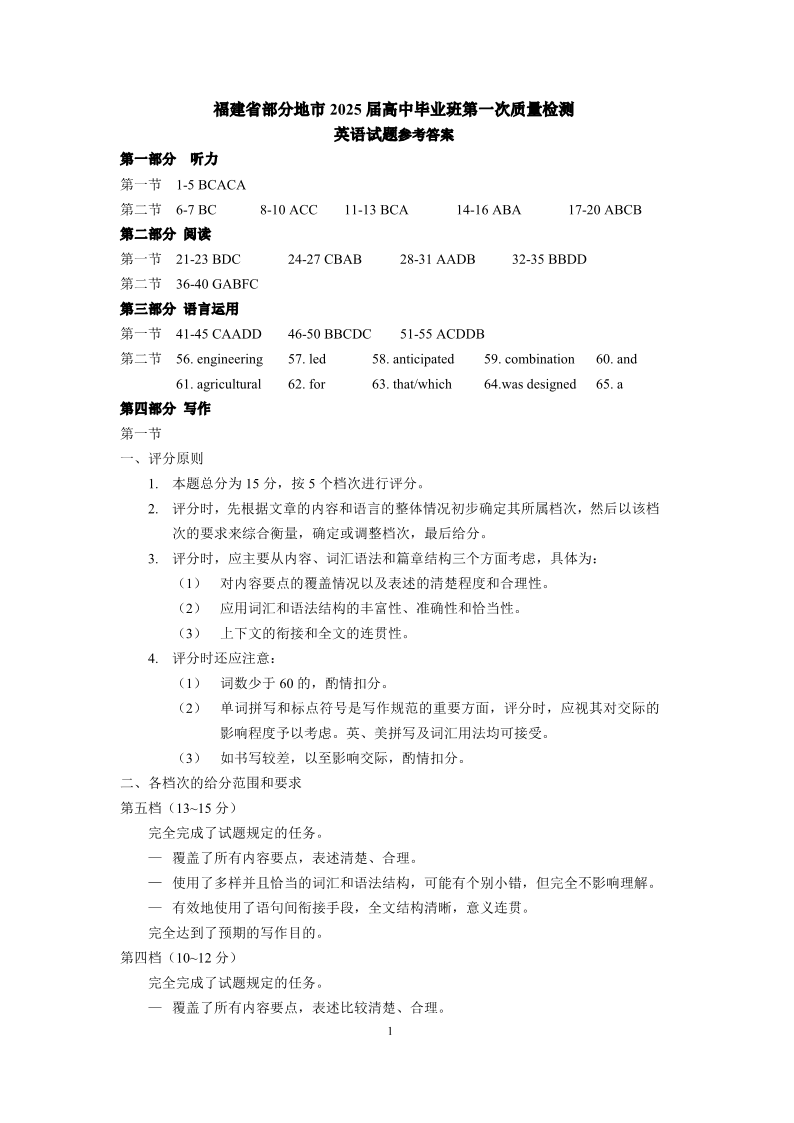福建省六市2025届高中毕业班第一次质量检测 英语答案.pdf