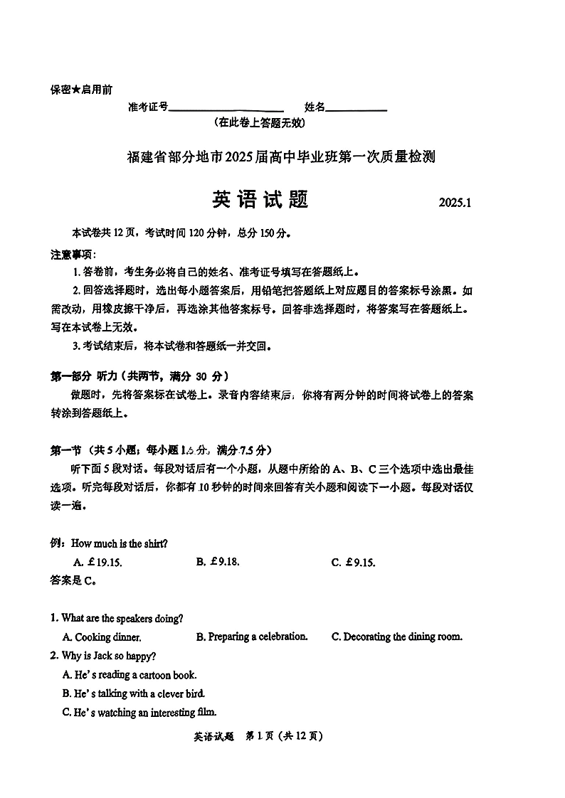 福建省六市2025届高中毕业班第一次质量检测 英语.pdf