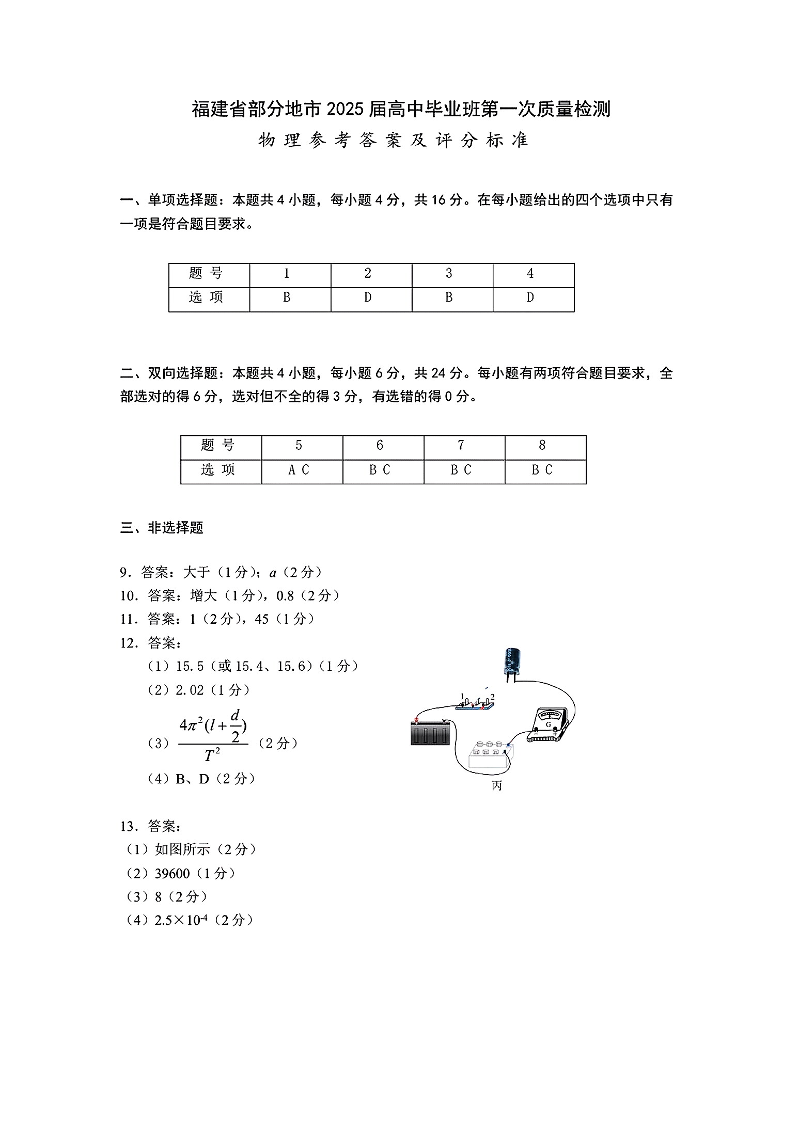 福建省六市2025届高中毕业班第一次质量检测 物理答案.pdf