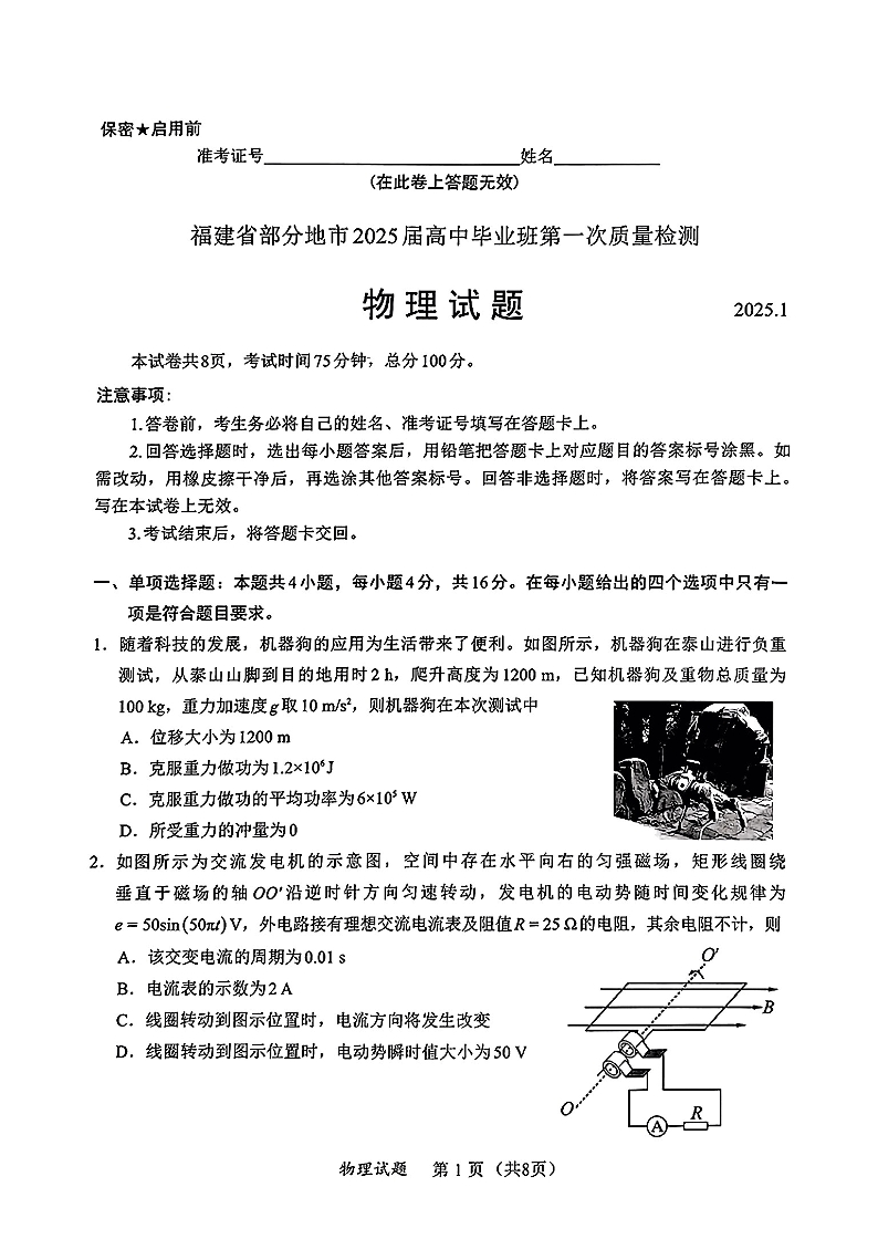 福建省六市2025届高中毕业班第一次质量检测 物理.pdf