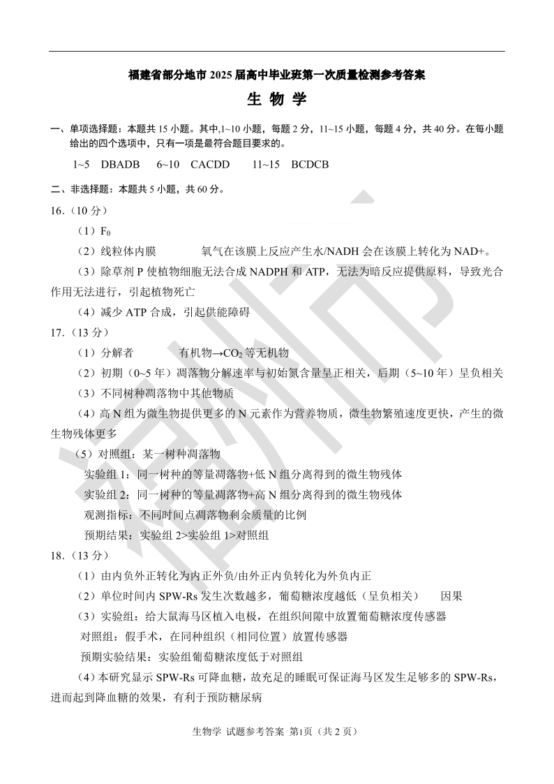 福建省六市2025届高中毕业班第一次质量检测 生物答案.pdf