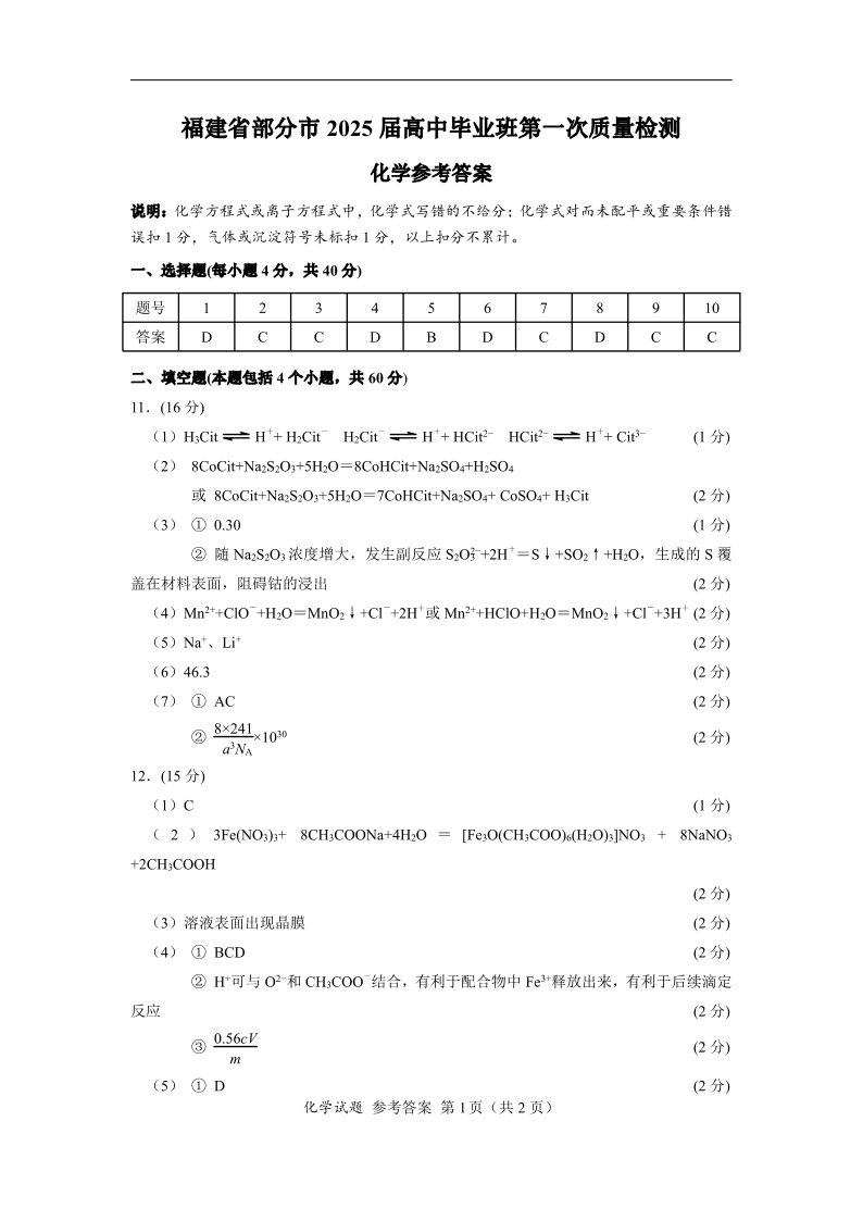 福建省六市2025届高中毕业班第一次质量检测 化学答案.pdf
