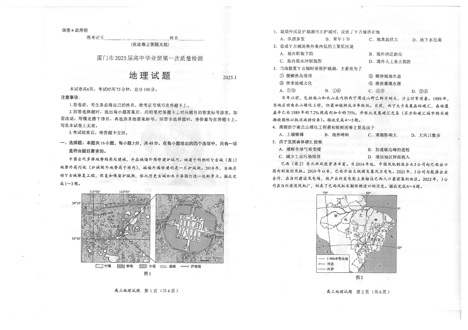 福建省六市2025届高中毕业班第一次质量检测 地理.pdf