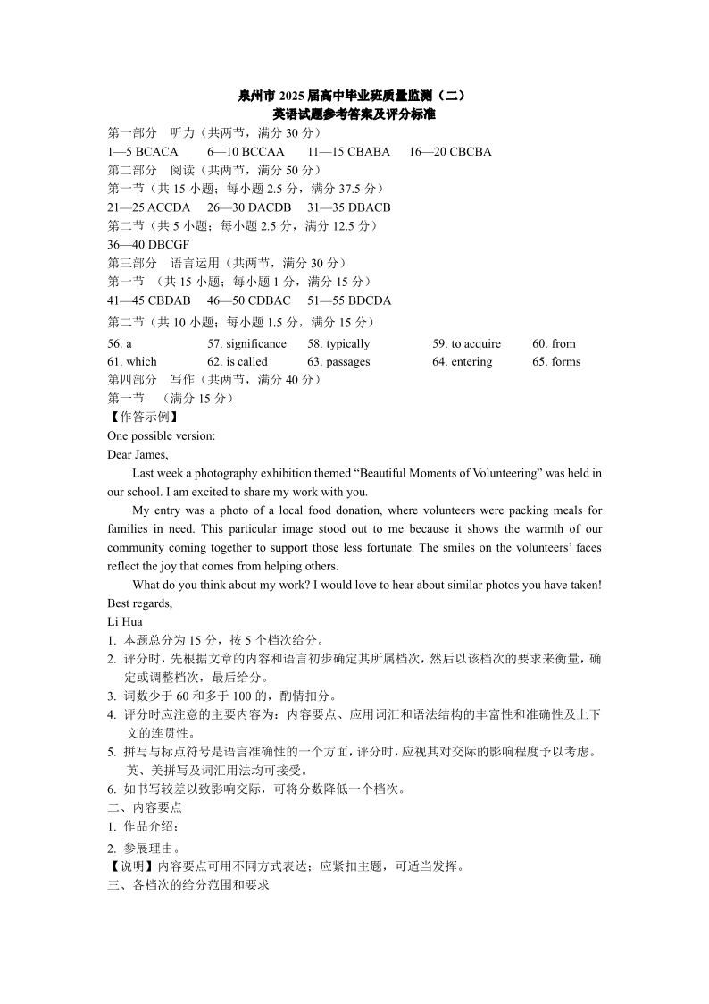 福建省泉州市2025届高中毕业班质量监测(二)英语答案.pdf