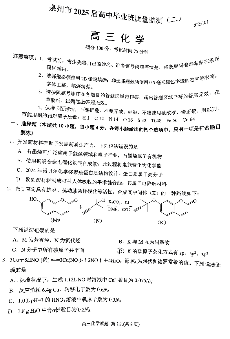 福建省泉州市2025届高中毕业班质量监测(二)化学.pdf