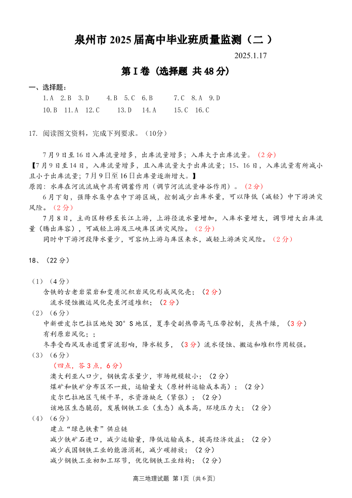 福建省泉州市2025届高中毕业班质量监测(二)地理答案.pdf