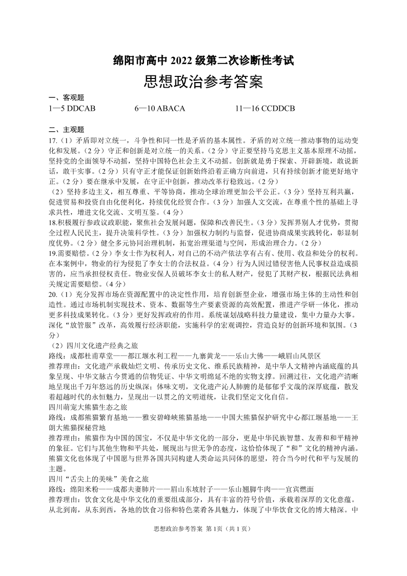 四川省绵阳市2025届高三第二次诊断性考试 政治答案.pdf