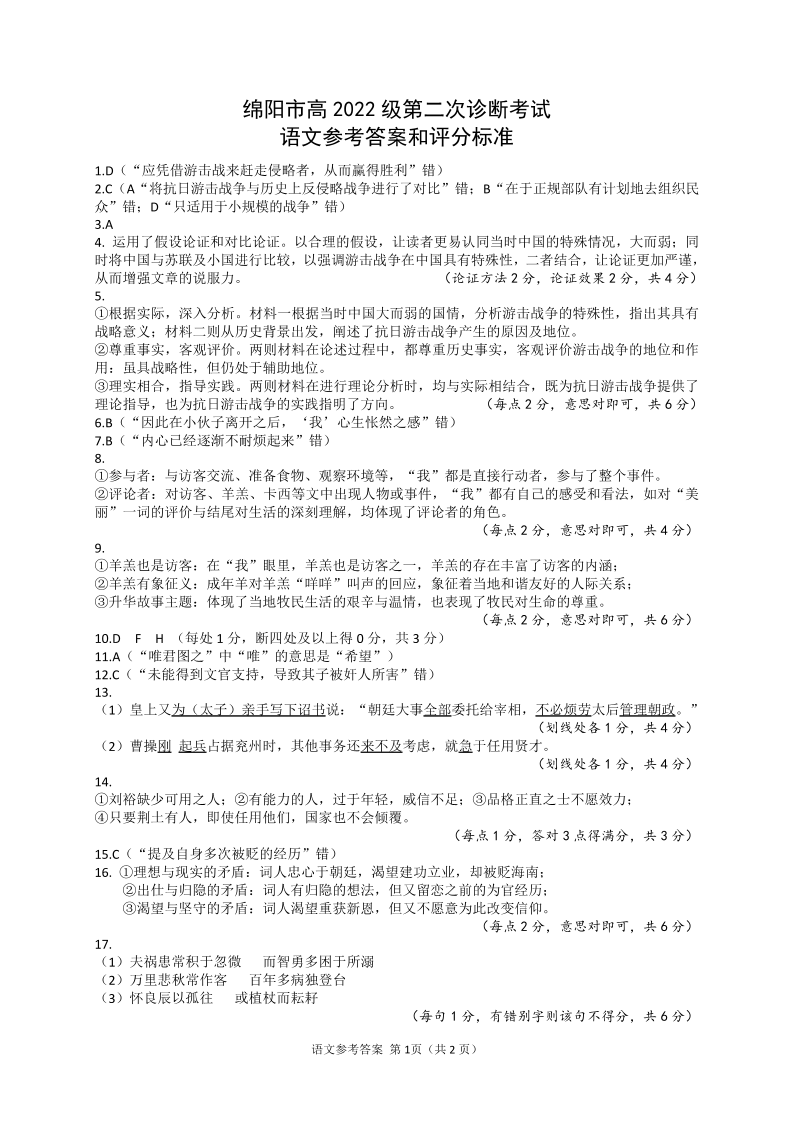 四川省绵阳市2025届高三第二次诊断性考试 语文答案.pdf