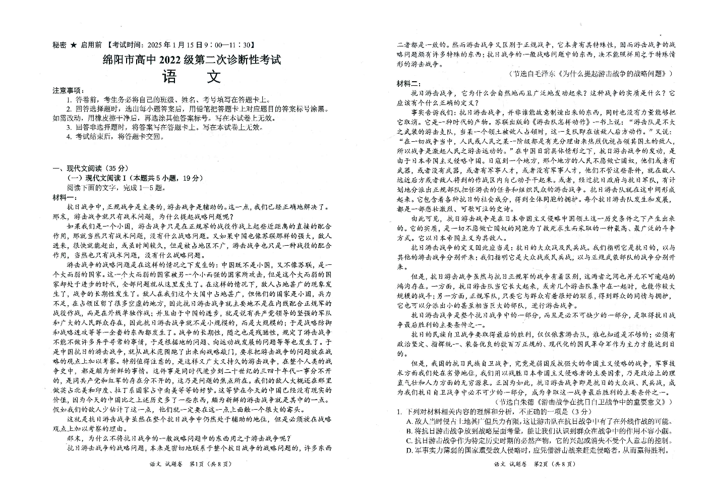四川省绵阳市2025届高三第二次诊断性考试 语文.pdf