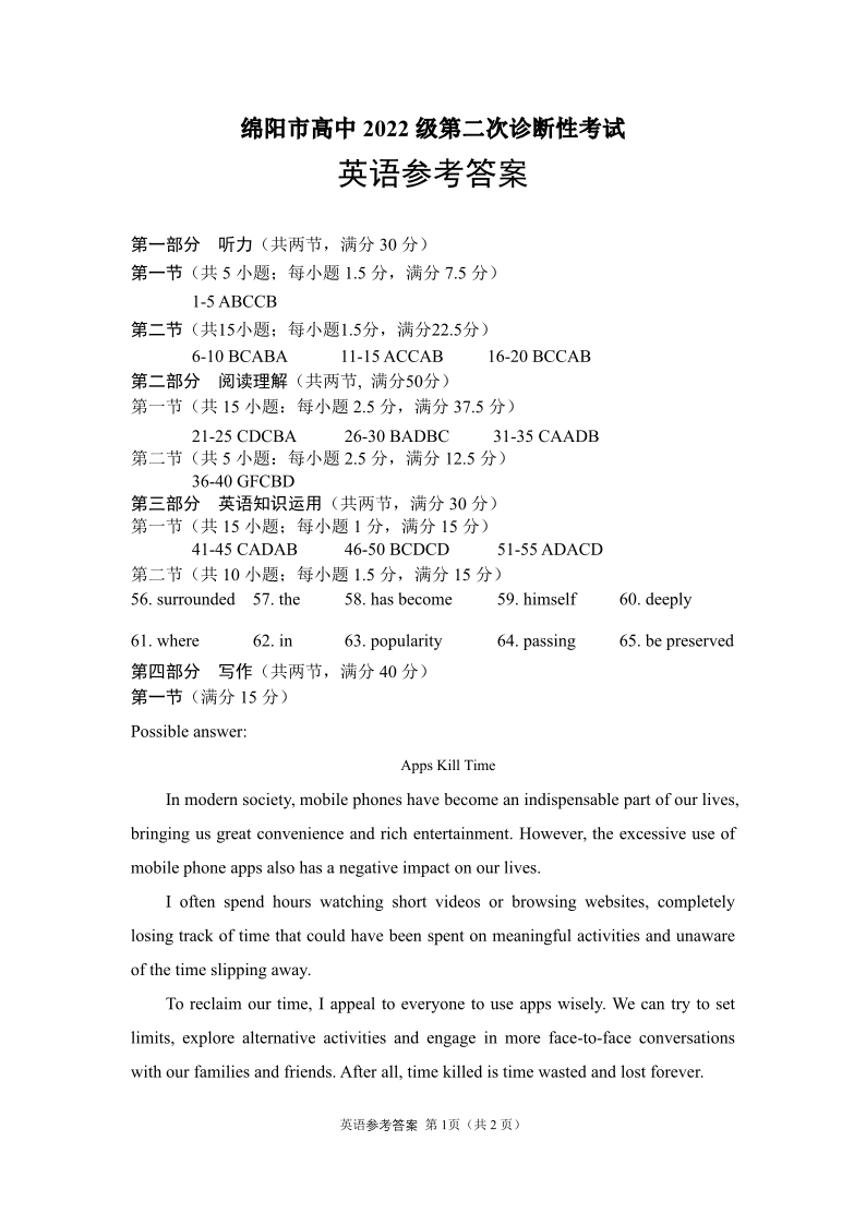 四川省绵阳市2025届高三第二次诊断性考试 英语答案.pdf