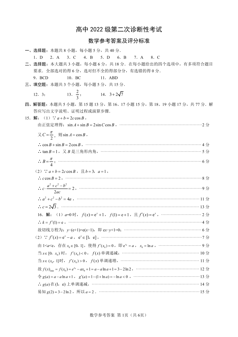 四川省绵阳市2025届高三第二次诊断性考试 数学答案.pdf