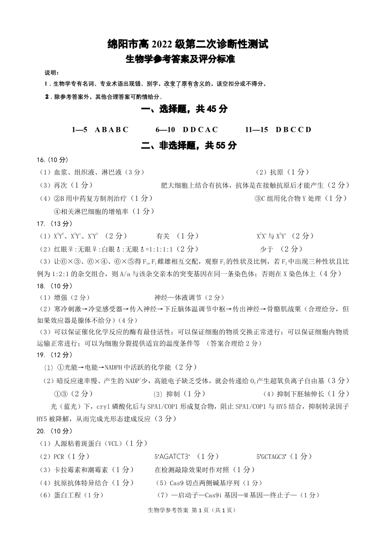 四川省绵阳市2025届高三第二次诊断性考试 生物答案.pdf