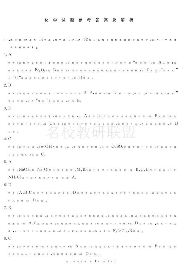 2027届地区期末化学答案.pdf