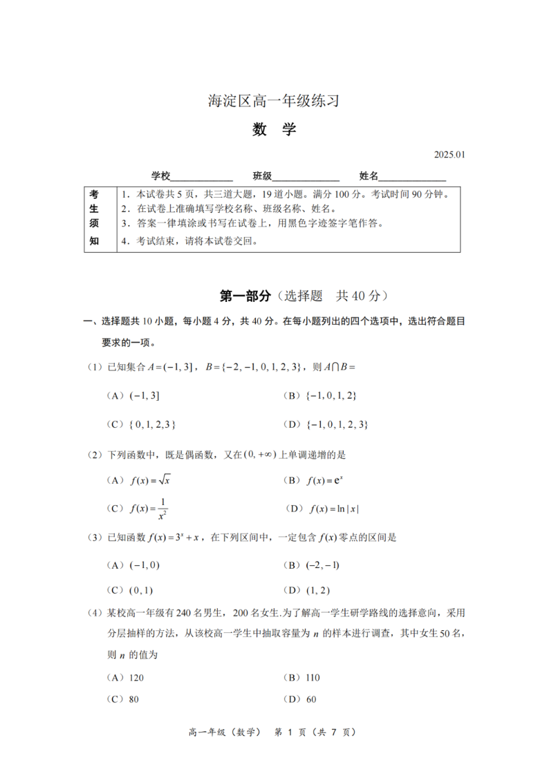 北京市海淀区2024-2025学年高一第一学期期末试卷 数学.pdf