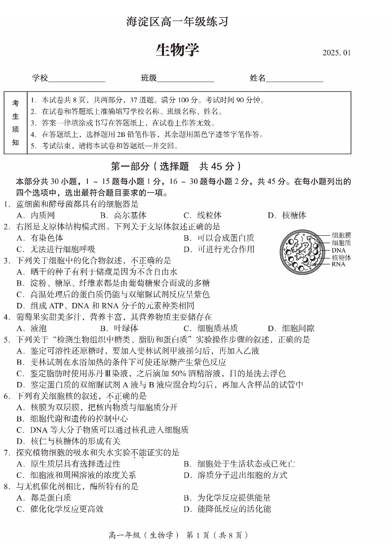 北京市海淀区2024-2025学年高一第一学期期末试卷 生物.pdf
