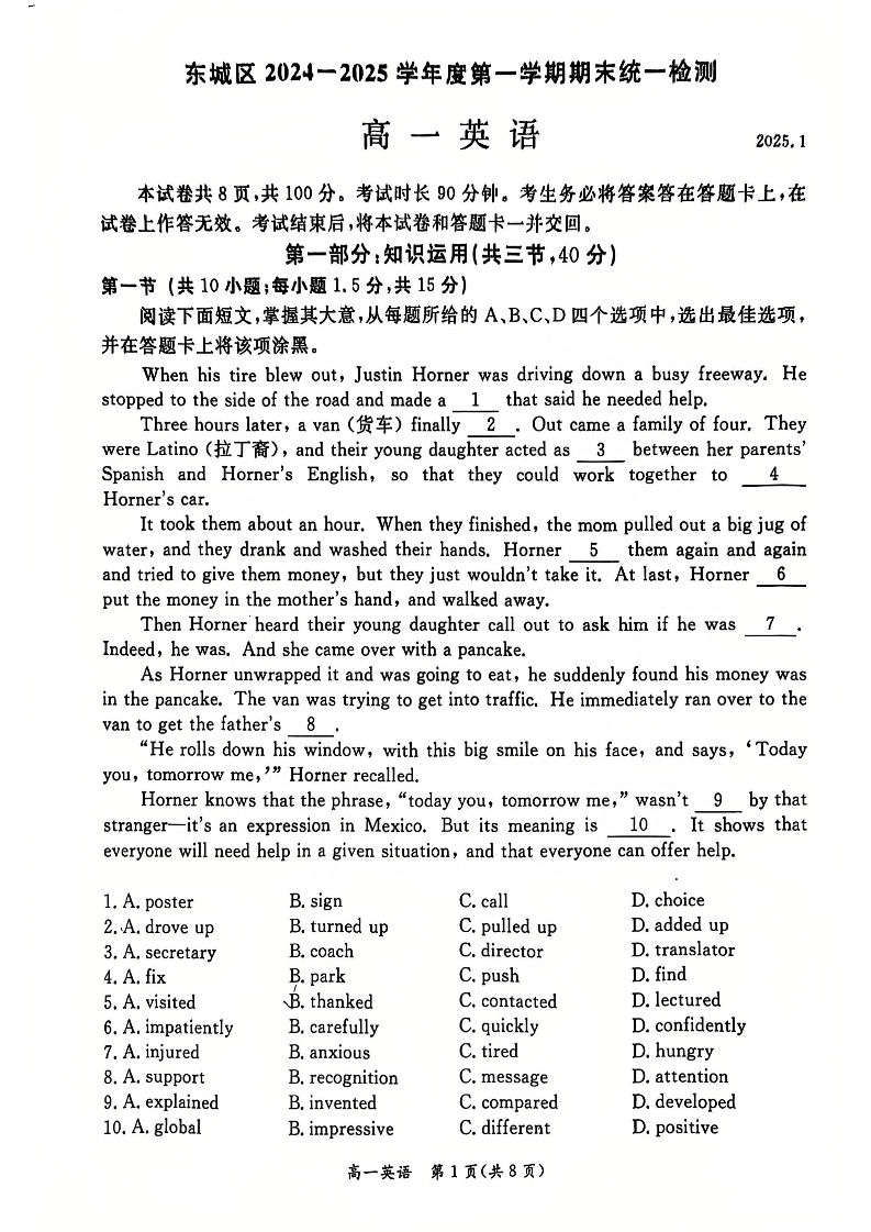 东城区2024-2025学年高一年级第一学期期末统一检测 英语.pdf